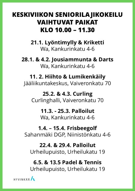 Keskiviikkoisen lajikokeiluryhmän ohjelma