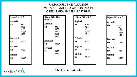 Hyvinkään kaupungin liikuntapalveluiden järjestämät kesäuimakoulut ovat yhden ja kahden viikon pituisia. Ryhmäkoko on 12, viikon A-uimakoulussa 10. Lapsen tulee täyttää ryhmään vaadittava ikä osallistumisvuoden aikana. Lapsen on osattava pukeutua ja peseytyä omatoimisesti. Uimakoululaisia ei ole vakuutettu uimakoulun aikana.