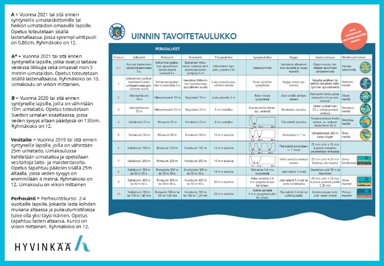 UIMAKOULUJEN TARKEMMAT SISÄLLÖT SEKÄ UINNINTAVOITETAULUKKO